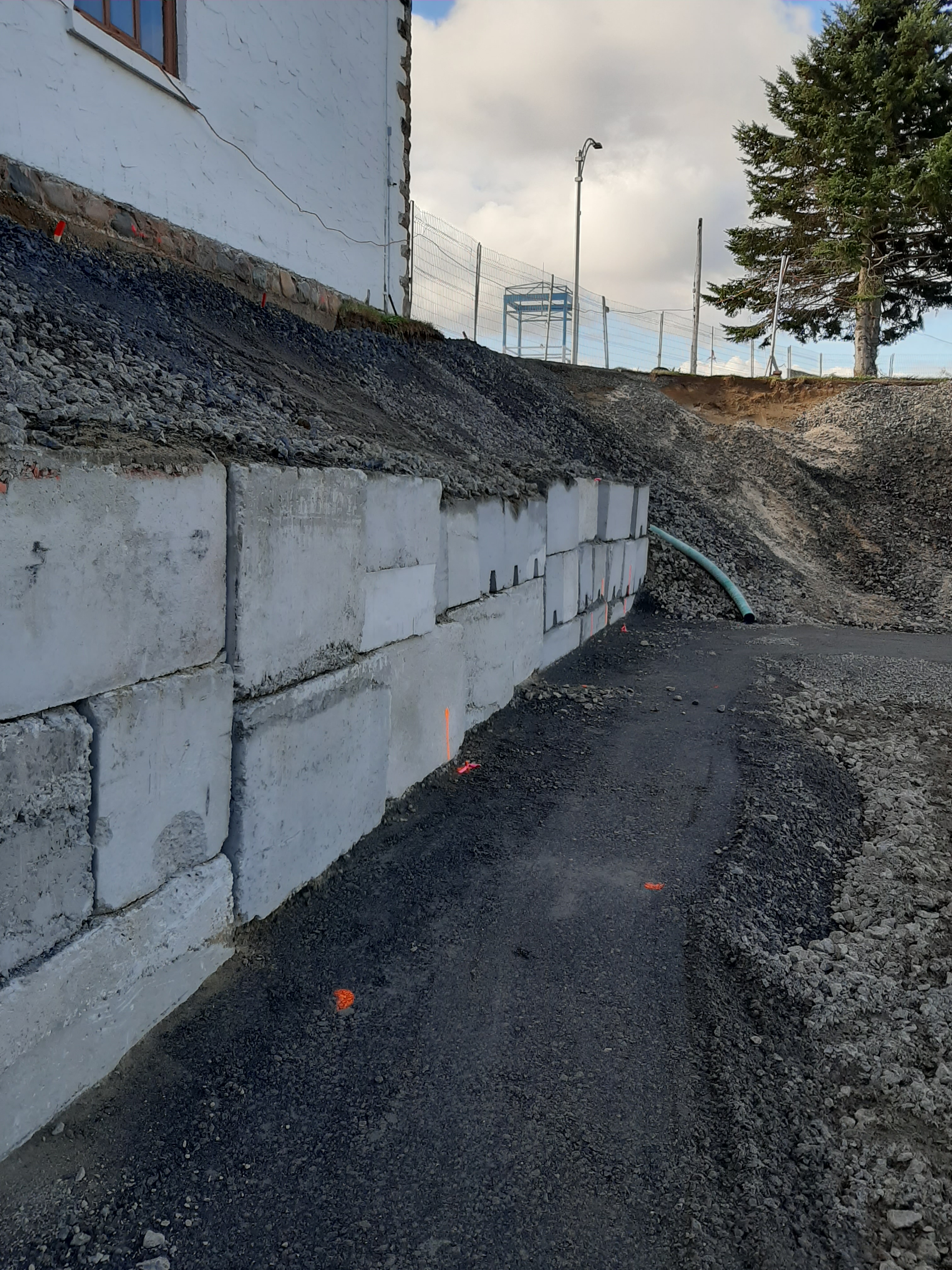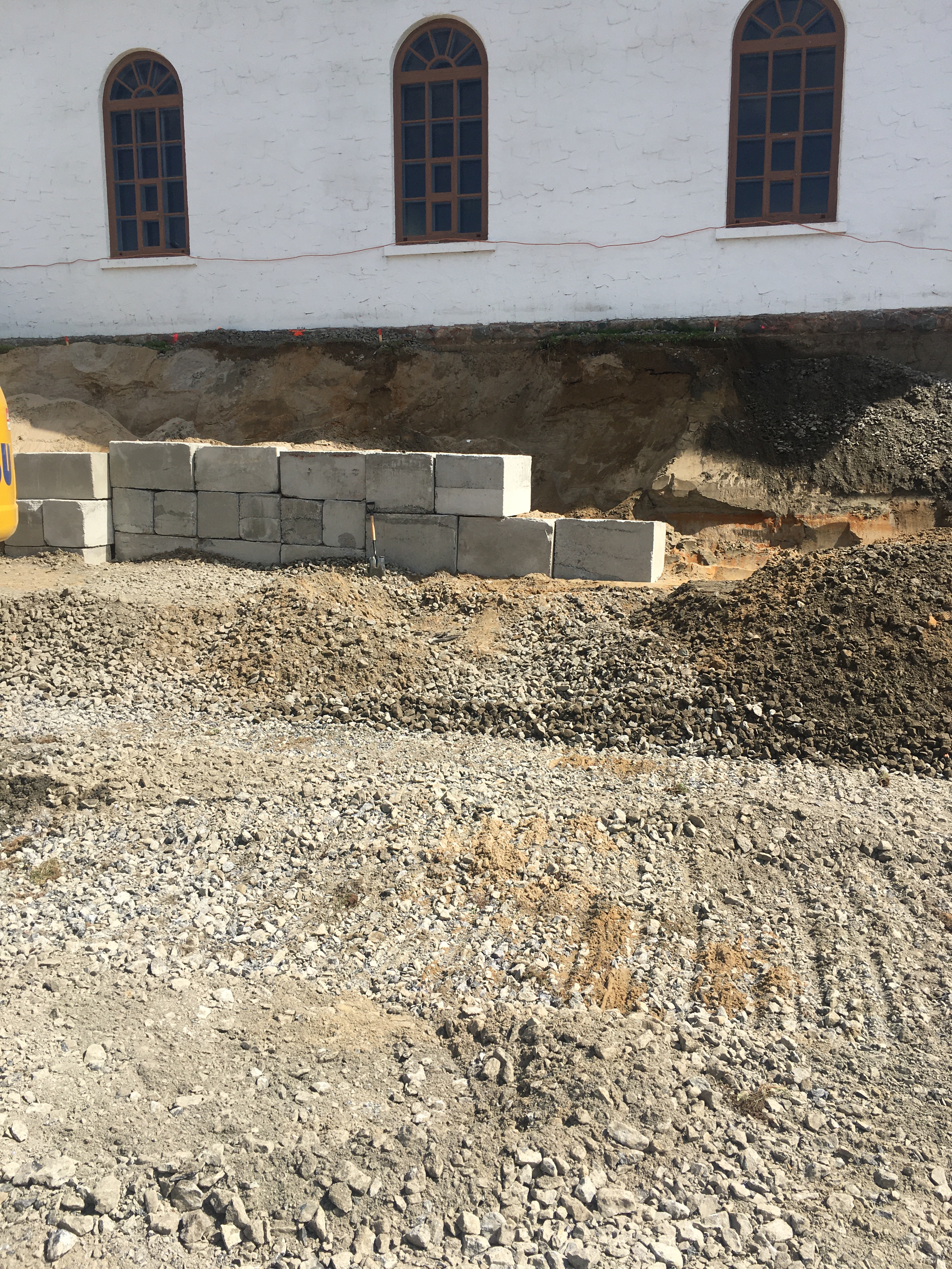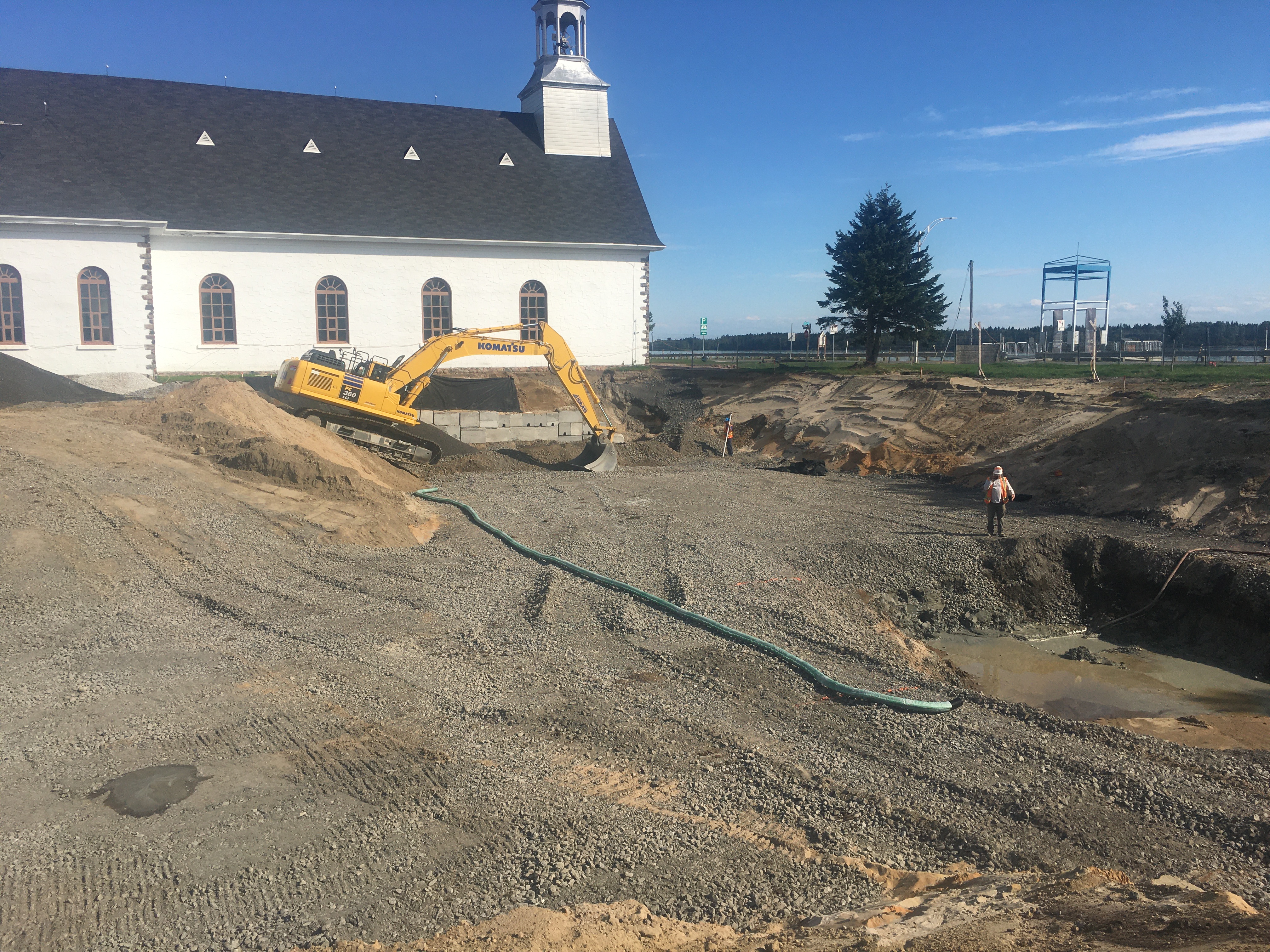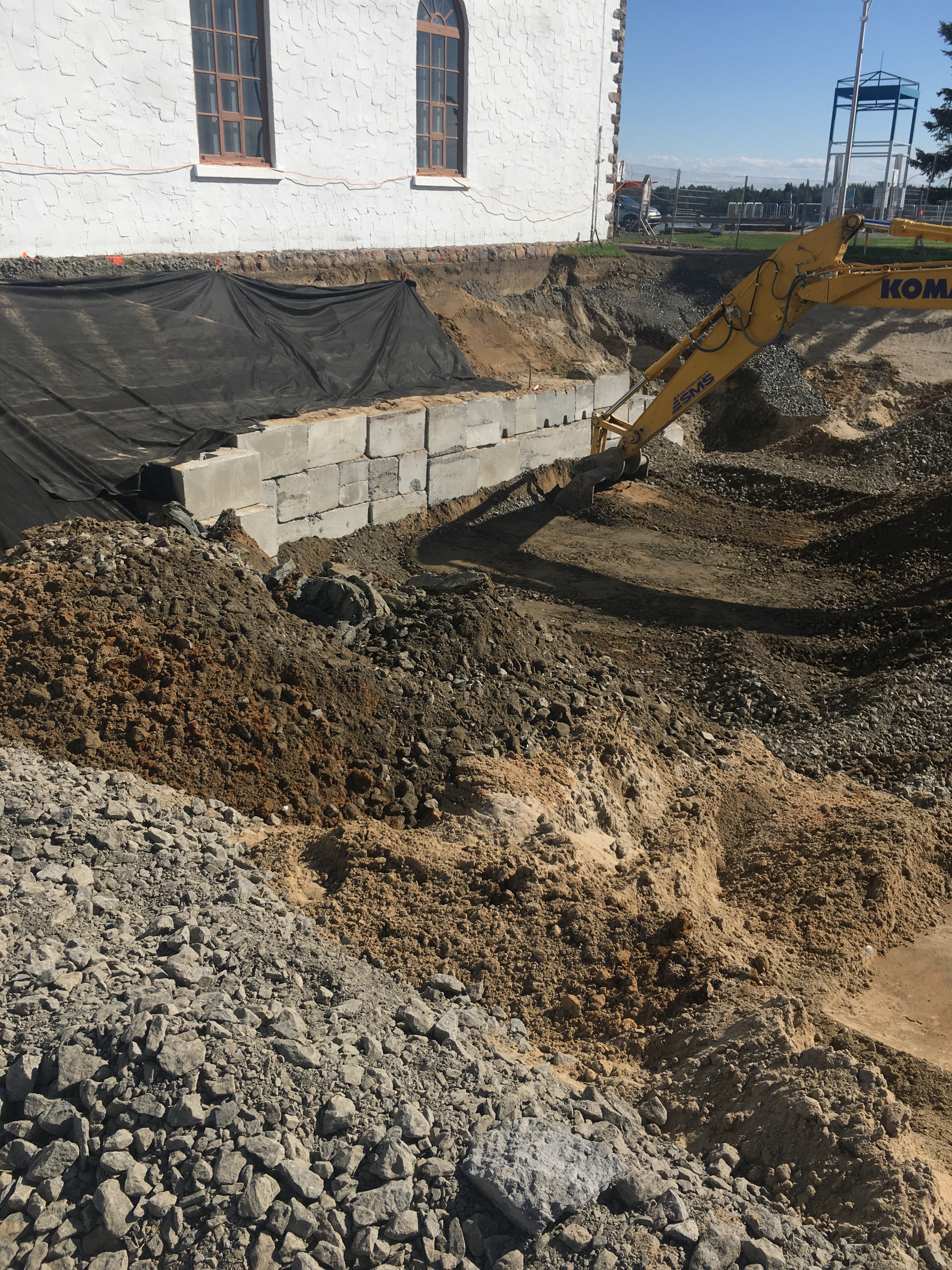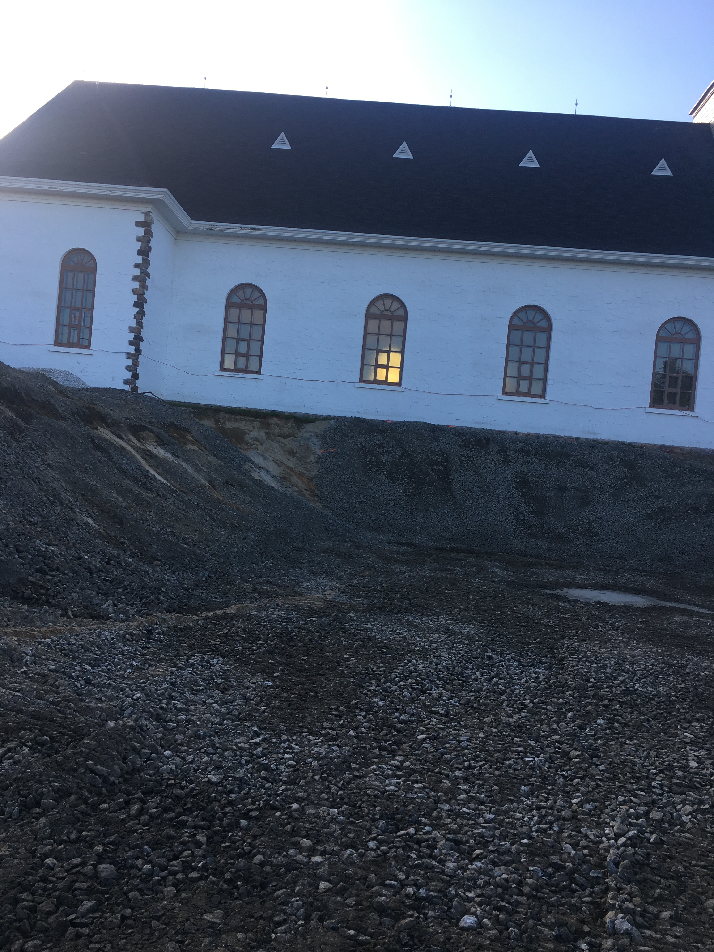 En effet, le niveau du plancher de l’église existante étant plus haut que celui du nouveau bâtiment Espace Péribonka, les fondations de ce dernier se devaient d’être beaucoup plus profondes dans le sol.