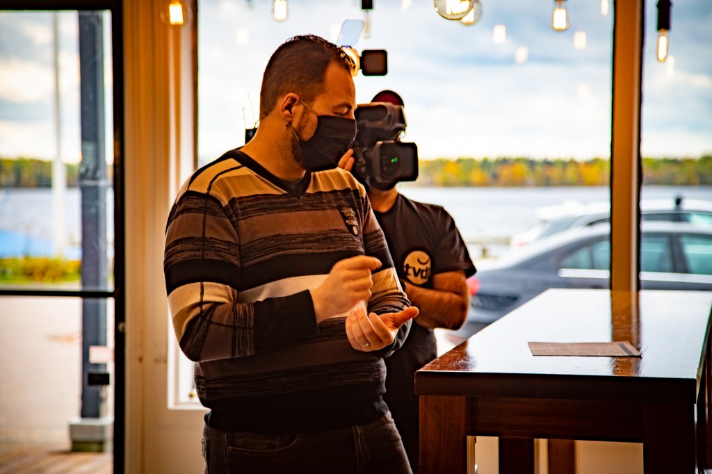 Il était important pour le comité de trouver des lieux représentatifs afin de filmer les entrevues. Il faut dire que les conditions météorologiques lors de cette journée de tournage n’étaient pas très clémentes et l’équipe a dû s’adapter en conséquence. Le Bistr’eau Pub Péribonka était donc l’endroit tout indiqué pour réaliser les capsules à l’intérieur.