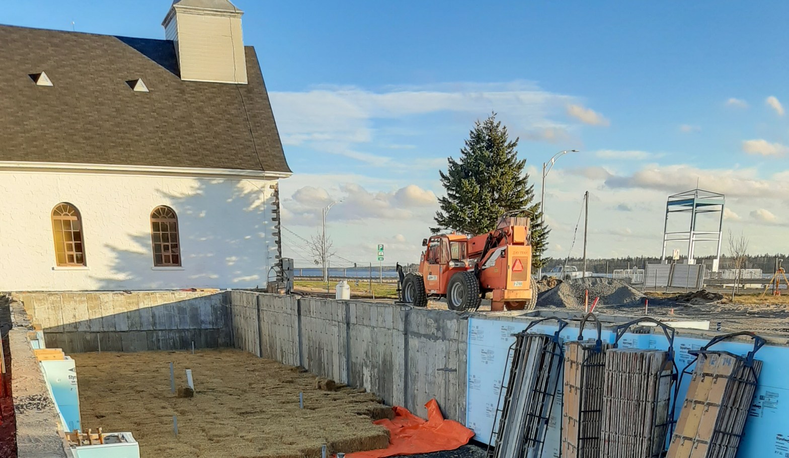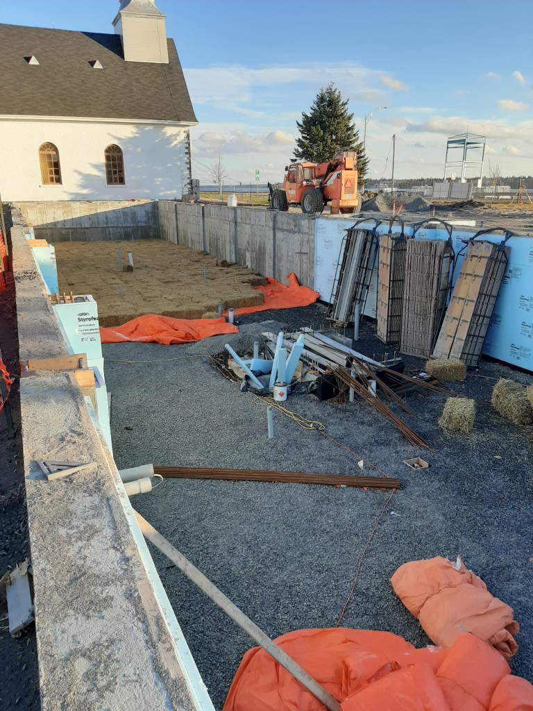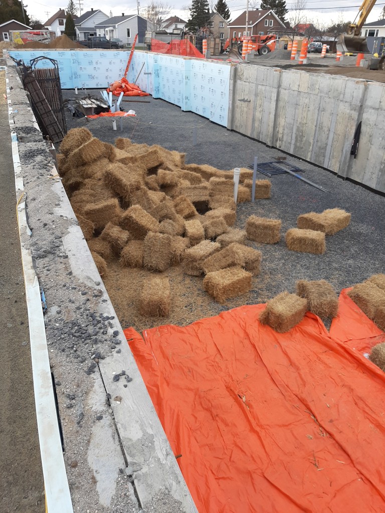 Considérant l’échéancier des travaux, le sous-sol devra demeurer à l’air libre une bonne partie de l’hiver en attendant que la structure soit érigée et que les murs et la toiture soient construits. Par souci d’économie de coût de chauffage, il a donc été convenu d’isoler le sol avec de la paille, un élément isolant efficace, recyclable et abordable qui, combinée avec des toiles isolantes et éventuellement de la neige, assurera une isolation adéquate et ce, sans chauffage. Des thermomètres seront installés pour vérifier la température du sol à tout moment. La paille provient d’agriculteurs locaux et sert normalement à créer des zones de confort pour les animaux des différentes fermes de la région. Il faut se rappeler qu’à une certaine époque, elle servait également à isoler des bâtiments. Lorsque le reste de l’ouvrage sera érigé et chauffé adéquatement, l’ensemble des balles de pailles pourront être retirées et retournées aux agriculteurs. La dalle de béton du sous-sol pourra alors être coulée avec un climat tempéré à l’intérieur et les travaux se poursuivront jusqu’au printemps.