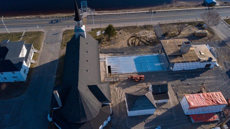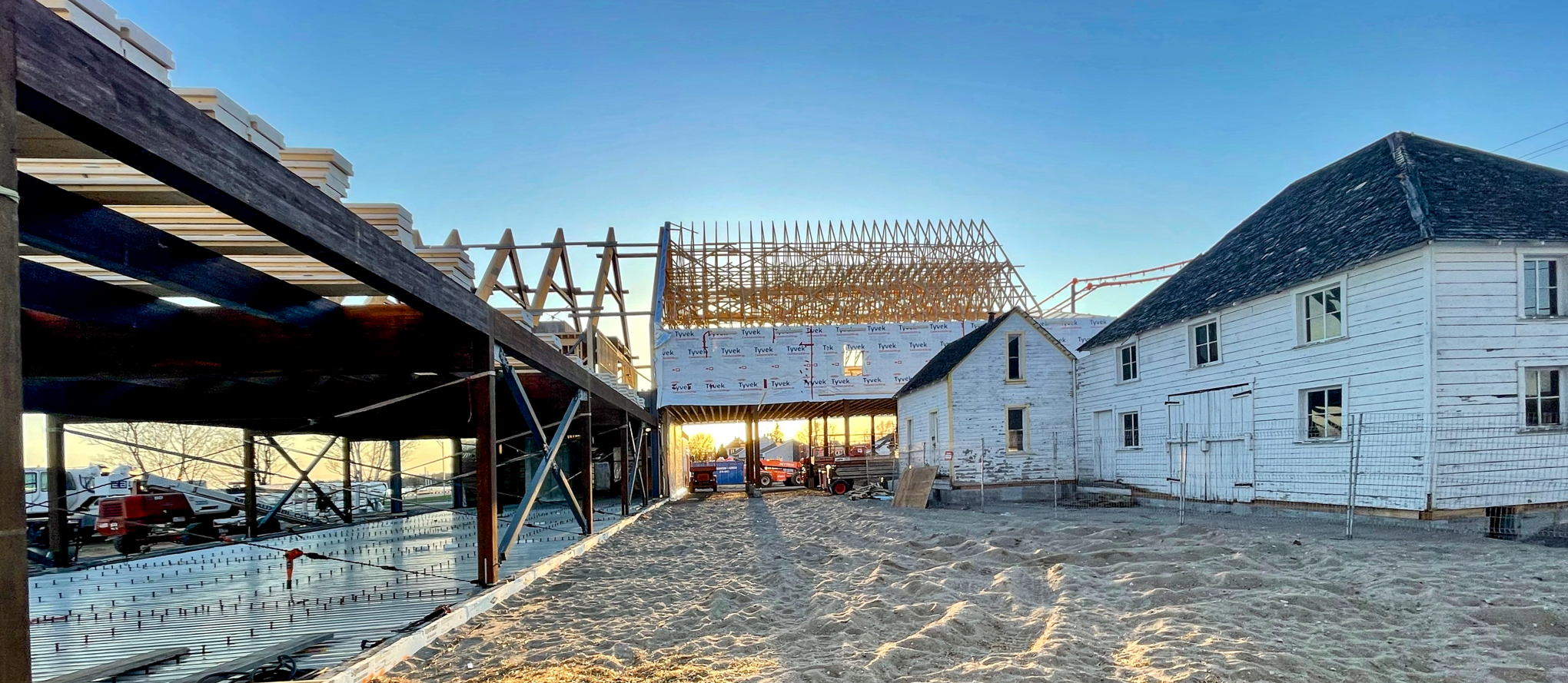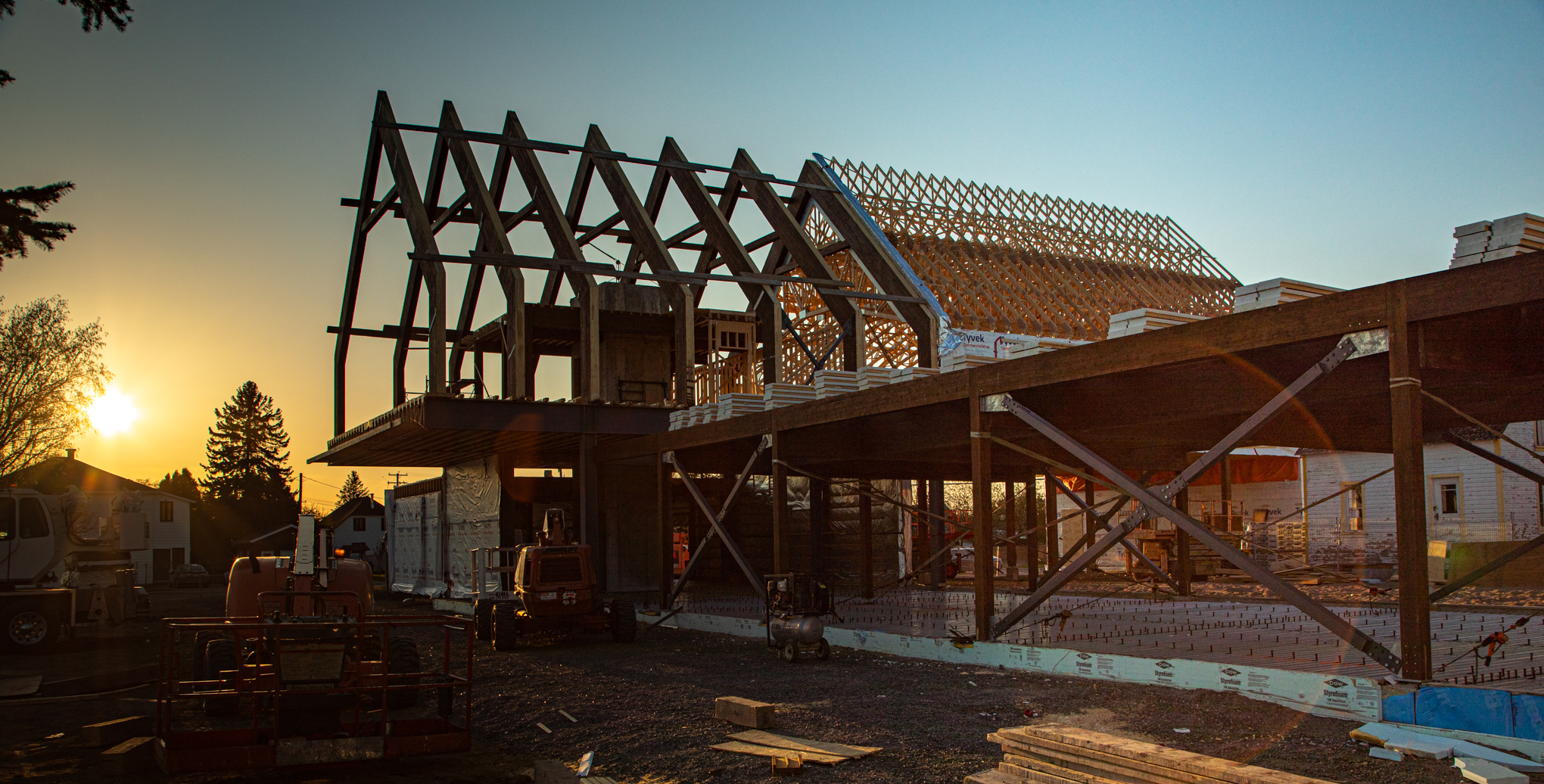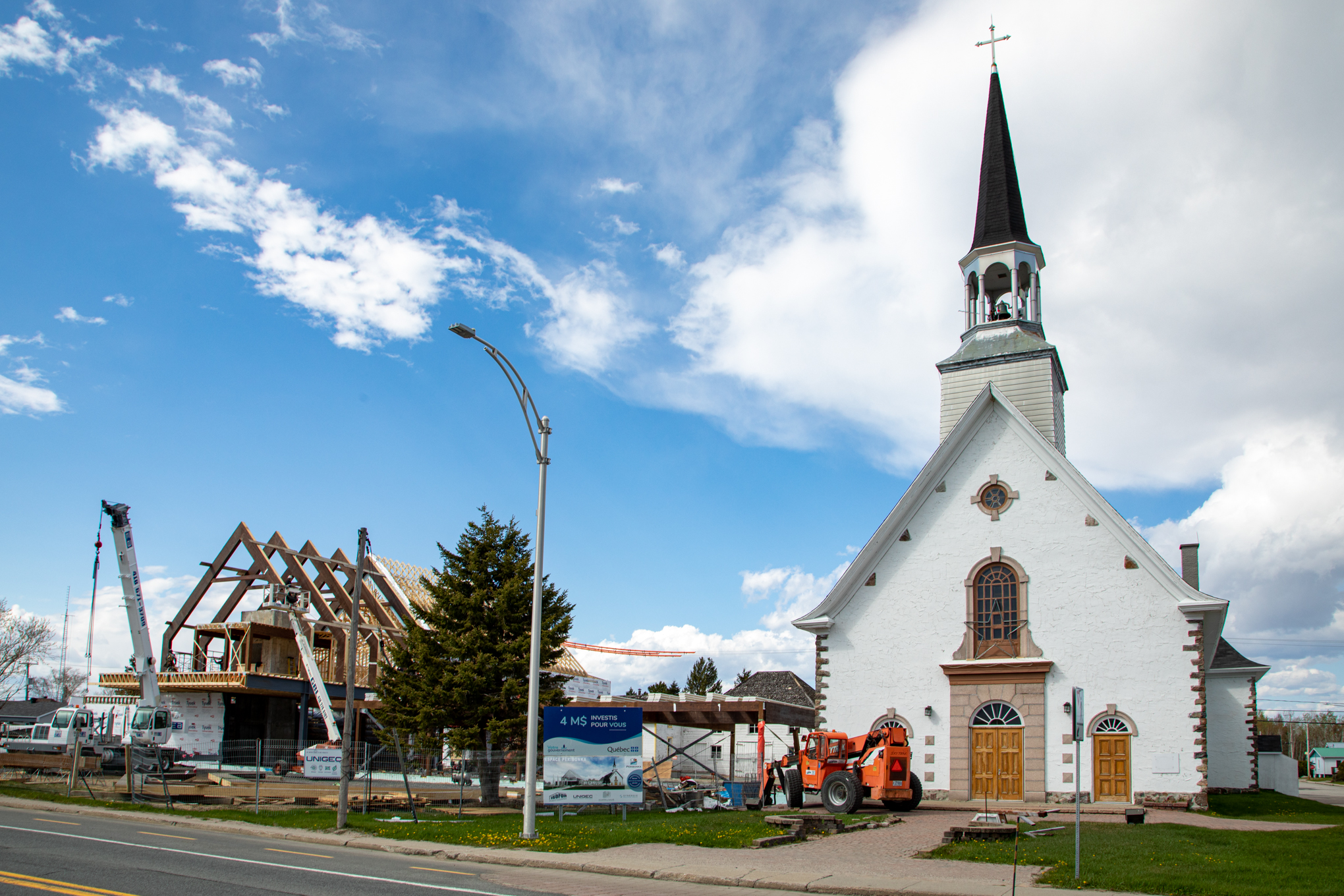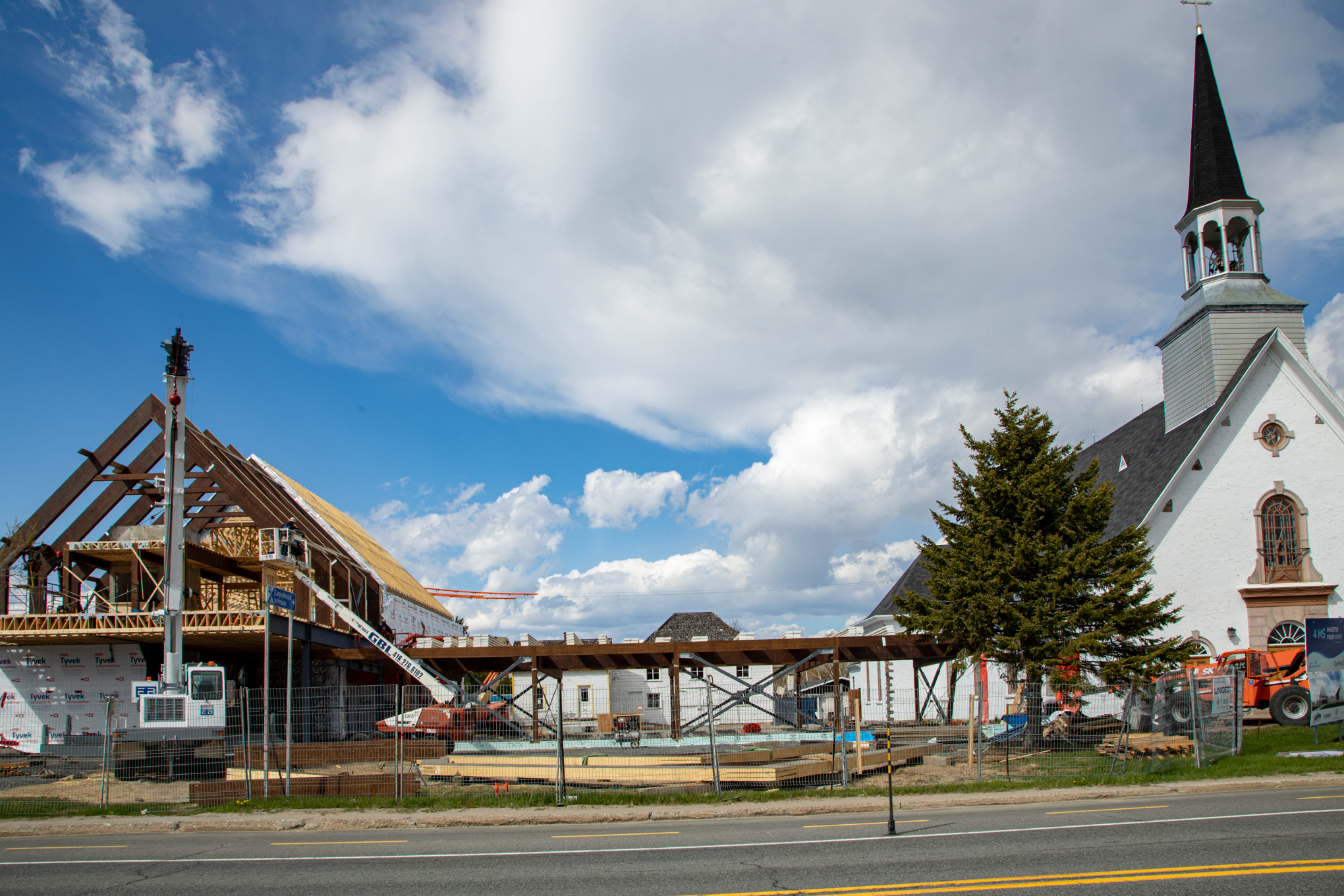 Les énormes fermes de toiture qui reprennent la forme originale de l’église adjacente sont mises en place par une toute nouvelle grue, visible à plusieurs kilomètres. Cette opération est délicate et doit être faite avec minutie et savoir-faire afin de positionner adéquatement chaque élément de structure au bon endroit et de faire les correctifs nécessaires sur place. À ce stade, il possible que certains éléments doivent être corrigés au chantier lors de l’érection de cette structure.