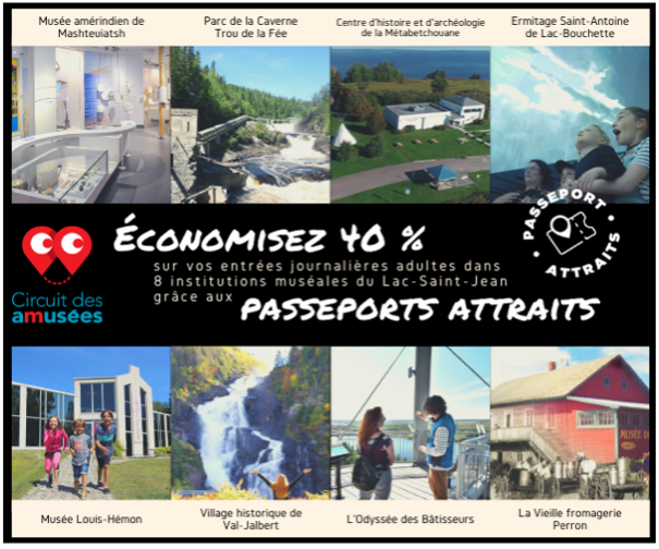 Cette année, le Musée participe de nouveau au Circuit des Amusées! Profitez d’un rabais de 40% sur vos visites dans 8 institutions muséales du Lac-Saint-Jean : 5 passeports différents sont disponibles! Visitez le site web du Musée pour vous en procurer : https://www.museelh.ca/passeport-attraits/. Les Passeports Attraits sont en vente seulement jusqu’au 25 juillet 2021. Faites vite!